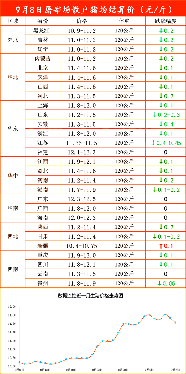 在国内生猪市场,9月8日,猪价跌势反扑,行情延续了下行的表现,生猪价格下挫0.11元,屠企报价跌至11.62元/斤,国内猪价大范围回落,但是,受北方行情走低,低价猪源出栏积极性减弱,市场挺价情绪有所反弹!