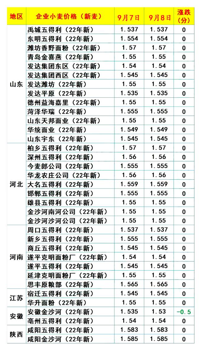 在国内小麦市场,每年8月末以及9月初,由于学生集中返校,而天气也将逐步转凉,面粉走货也将进入旺季,小麦价格有大幅上涨的表现!但是,今年8月底以来,小麦价格虽然呈现涨势,但是,上涨表现低迷,国内制粉企业挂牌报价适重横盘1.54~1.57元/斤!
