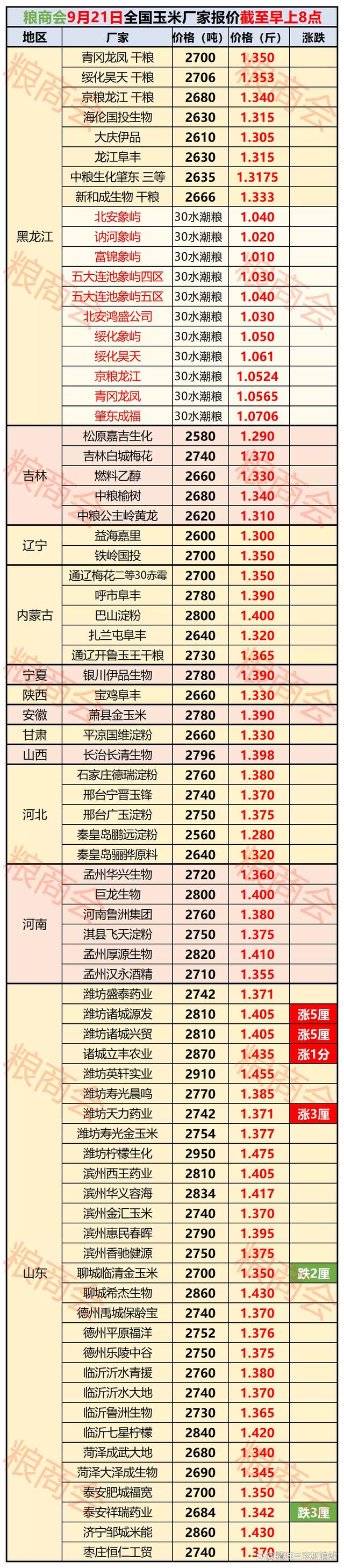 玉米高开暂时坚挺,国庆备货有所利好!各地新玉米陆续高开,但当前上量不多,黑龙江东部潮粮收购0.98-1.0元左右,辽宁黑山和锦州烘干塔收1.05-1.06元左右,新粮上量不多,主要是以购销陈粮为主。而华北地区真的偏弱,深加工根据到货情况小幅波动调整,新粮价格跟随厂家和陈粮价格波动。临近国庆小长假,下游备货积极性有所提升,饲料养殖优质玉米供需有所偏紧,行情短期内仍是偏强运行!但也需要注意,国庆长期后,下游需求采购将有所放缓,新玉米上量也将陆续增多,湖北河南安徽等地夏玉米也即将陆续收割上市,十月行情预计将随着收割上量逐步增多,玉米行情偏弱回落为主!很可能会像去年一样出现一个跟随收割上量节奏,上量越来越多逐步回落行情。然后跌到一定程度基层惜售、粮商全面收购建仓、各地粮库大企业陆续开收,行情再度逐步坚挺起来小涨趋势持续!预计十月中旬前后是新玉米上量集中价。短期玉米行情仍是关注各地新粮收割上市节奏,预计短期偏强,但后续十月震荡回落偏弱为主,而中长期在全球农产品仍处紧供需的大背景下,玉米后市行情仍可期!中长期行情持续看好为主!建议等当地上量集中时适当考虑收购建仓!建议各位粮商、特别是华北地区,即便当前收购高位价格走不动货也不要着急建仓做库存,真正的玉米上量还是后面,夏玉米还没来呢!