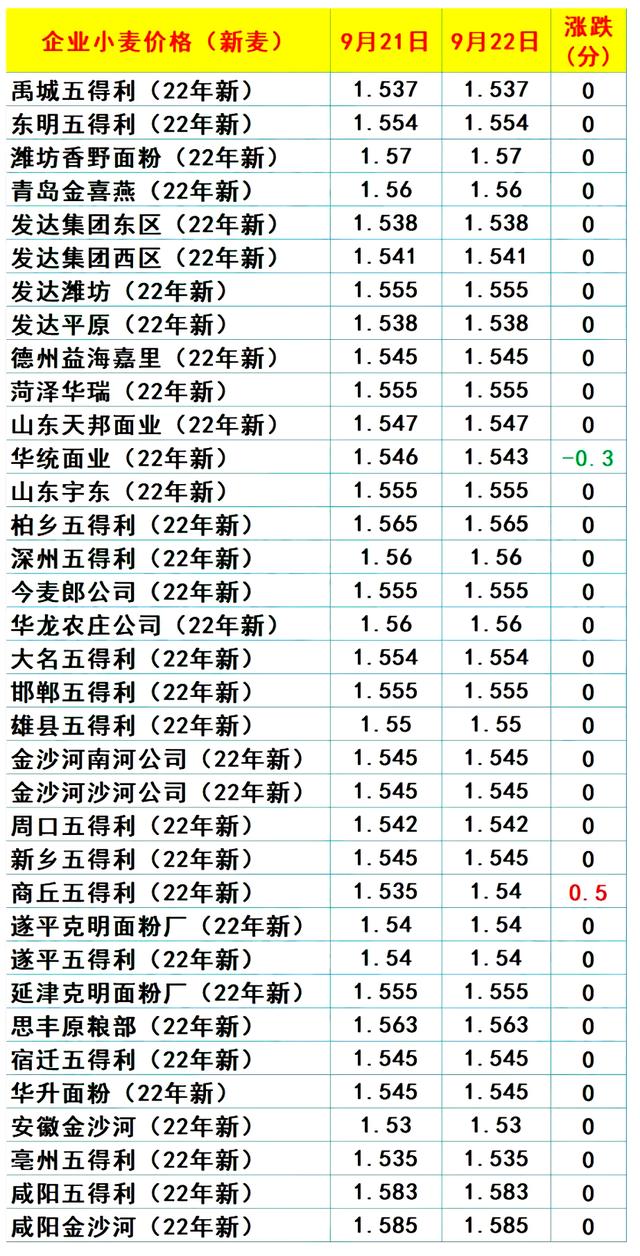 9月进入尾声,新粮玉米陆续上市,小麦市场仍有腾库的压力,但是,由于贸易商腾库规模有限,现阶段下,国内小麦价格仍按照企业上量呈现窄幅震荡的变化,国内主流制粉企业,小麦挂牌限价维持在1.53~1.56元/斤左右!