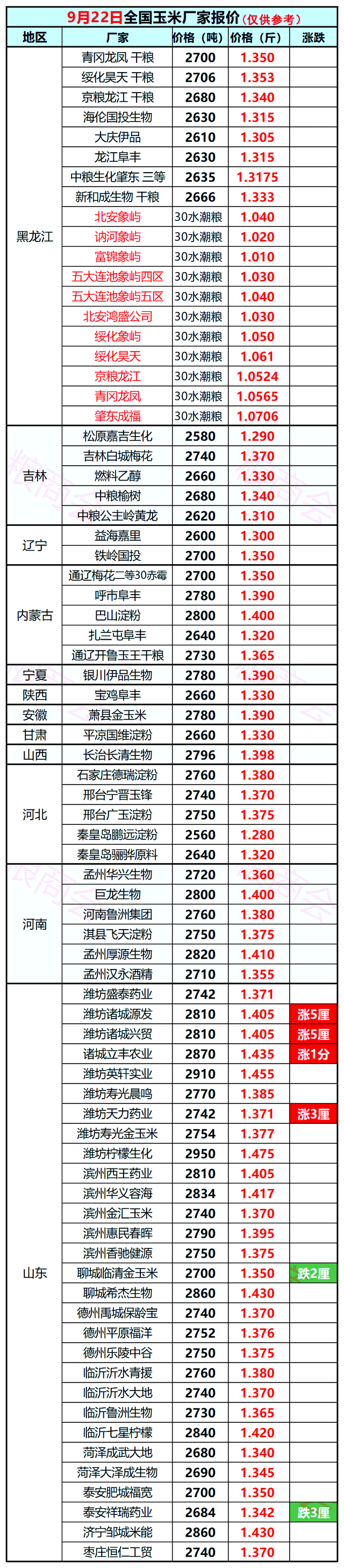 其中,河北以及河南地区,深加工报价全面企稳,河北行情普遍横盘1.37~1.38元/斤!而在山东地区,随着企业上量进一步减少,工厂开工率不断恢复,补库意愿增加,山东多地企业报价上涨,其中,诸城源发、诸城兴贸、诸城立丰、潍坊天力报价上涨6~20元/吨,临清金玉米以及泰安祥瑞,报价下跌4~6元/吨,山东主流玉米报价横盘1.34~1.43元/斤!