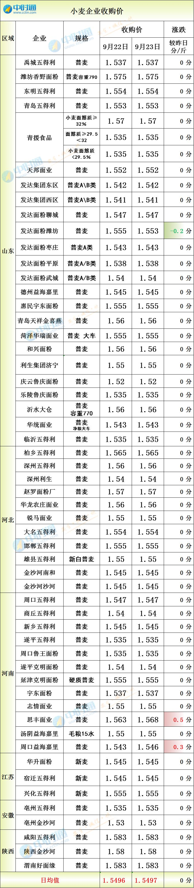 今日小麦价格整体趋稳,个别企业小幅上调收购价格,思丰面业小麦收购价格1.568元,较昨日涨5厘,周口益海嘉里小麦收购价格1.546元,较昨日涨3厘,天邦面业小麦收购价格1.552元,深州五得利小麦收购价格1.56元,周口鲁王面粉小麦收购价格1.535元。据不完全统计,今日国内面企收购均价为1.5497元/斤,小幅上涨。