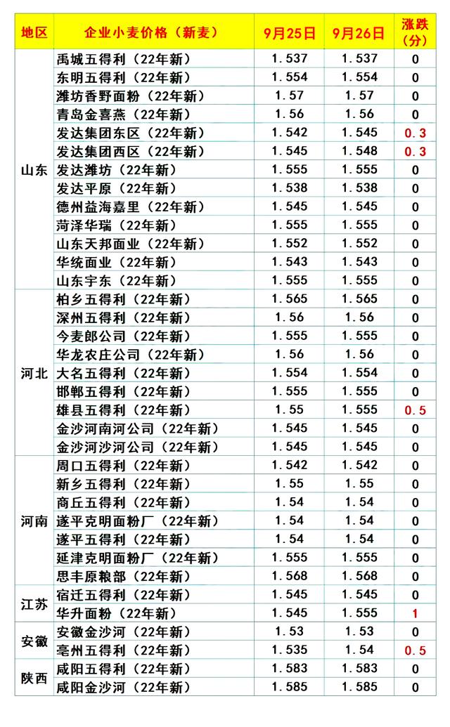 据数据显示,在国内市场,山东地区,发达集团西区以及东区报价上涨6元,主流企业报价横盘1.54~1.57元/斤。河北地区,雄县五得利报价上涨10元,主流小麦挂牌报价1.545~1.56元/斤。在河南地区,五得利以及克明淀粉报价普遍企稳,小麦挂牌价维持在1.54~1.56元!而在江苏华升面粉以及安徽亳州五得利,小麦挂牌报价上涨10~20元/吨,其中,亳州五得利报价1.54元/斤!