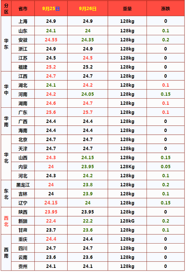 9月26日,全国标猪出栏均价下跌0.04元,屠企报价跌至24.24元/公斤!东北、华北地区,猪价普遍下跌,而在华东以及华中地区,猪价横盘偏弱,在华南部分地区,猪价震荡偏强,国内猪价呈现稳中偏弱的走势,涨跌幅度维持在0.1~0.2元/公斤左右!