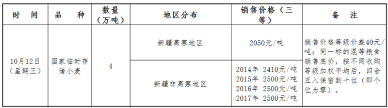 9月27日,国家粮食交易中心发布交易公告,10月12日新疆地区将投放国家临时存储小麦4万吨。