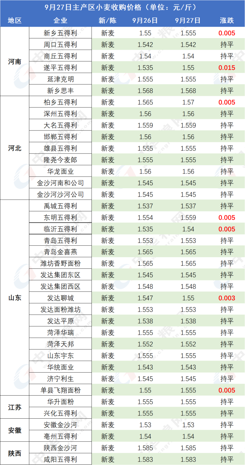 禹城五得利:9月28日起普麦上调5厘,调后价格1.542元/斤。优质麦02-1和新麦26上调1分,调后价格1.66元/斤。