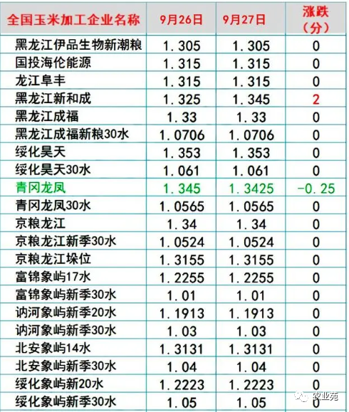 在东北地区,早熟玉米陆续收割,开秤价以高开企稳为主,市场零星上市,陈粮贸易商有惜售等价的情绪,玉米购销偏弱,价格以横盘为主!东北市场,深加工玉米报价大部横盘,目前,黑龙江地区,新季潮粮收购价普遍在1.06~1.06元/斤,陈粮玉米报价横盘1.3~1.35元/斤左右。其中,黑龙江新和成干粮挂牌报价上涨40元,执行价1.345元/斤;青冈龙凤报价下跌5元,执行价1.3425元/斤。