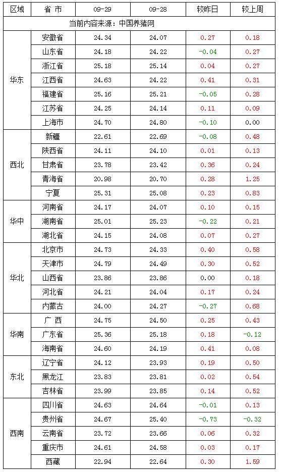 从全国分区市场来看,9月29日,国内南北市场,猪价延续普遍上涨的表现,涨幅维持在0.01~0.41元/公斤,下跌幅度维持在0.01~0.73元!目前,在东北市场,屠企报价23.83~24.12元/公斤,辽宁行情涨入“24元时代”。而在南方市场,川渝地区,猪价涨至24.6元/公斤左右,江浙市场屠企报价24.25~25.18元/公斤,山东地区,屠企报价24.18元/公斤!