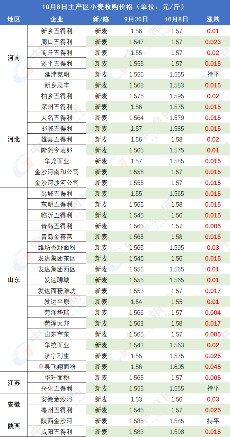 这个国庆假期小麦上涨明显,多家企业收购价格上涨1.5分-2分,山东个别企业价格已到1.6。今日小麦上涨有所放缓,天气放晴小麦上量增多。山东菏泽天邦粮油落价5厘,收购价格1.58元/斤。金沙河变相落价,水分标准调整为12%增减。