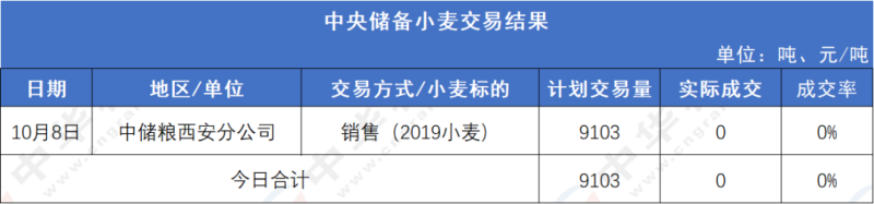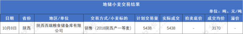 中储粮西安分公司(咸阳直属库)计划销售2019年小麦9103吨,底价3240元/吨,全部流拍。