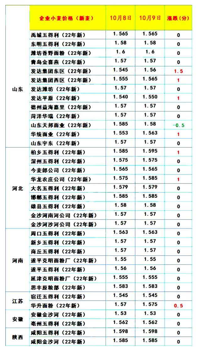 从国内最新报价来看,在冬小麦主产区,山东、河北以及河南地区,主流制粉企业报价企稳,其中,山东发达集团、发达平原、华统面业报价上涨20~30元/吨,五得利持续涨价后,观望情绪转浓,山东主流制粉企业小麦报价1.55~1.58元/斤!山东天邦报价窄幅下跌10元/吨!