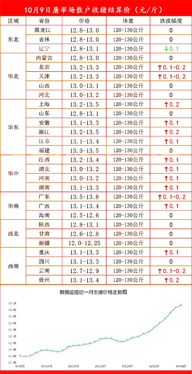 从国内分区报价来看,10月9日,猪价延续普遍上涨的表现,但是,北方市场,猪价涨势明显回落,东北部分地区,猪价率先走跌,目前,黑吉辽行情徘徊在12.8~13.1元/斤,华北市场屠企报价普遍涨至12.8~13.3元,京津市场冲高13.3元/斤!在南方市场,西南、华东、中南地区,猪价稳中偏强,高价地区,川渝、江浙、两湖、两广地区,猪价重心再次上移,广东局地行情涨至13.8元/斤!
