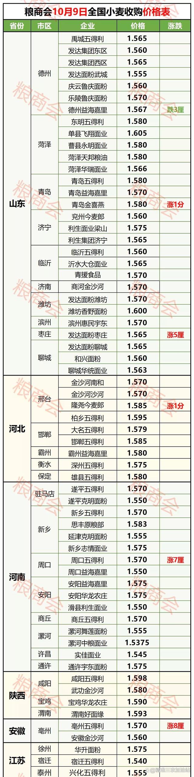 小麦上量增多,涨价放缓!何时出手结合自身条件!随着国庆期间的小麦价格持续上涨,多家主流面粉厂达到1.57-1.585的挂牌价,基本加上增价都在1.6了。而前两天就和大家说过可能会震荡,随着价格高位再加上雨过天晴,市场上量近两日有所增多!随着上量增多,小麦的持续上涨行情也将有所止步放缓!然后可能出现阶段性震荡小跌行情。但对于整体后市行情而言,已然非常明朗,后市冬季传统旺季面粉需求越来越好,余粮越来越少,小麦后市逐步上行只是时间问题!预计面粉厂挂牌价后市年底前达到1.65左右没问题。大家根据自身质量、资金、仓容决定何时出手。
