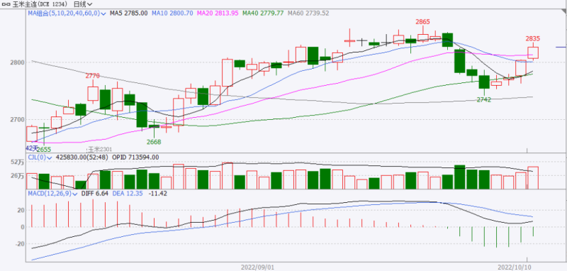 10月11日,受国际局势影响,美麦强势大涨,国内连玉米继续攀升,触及半个月高点2835元/吨。