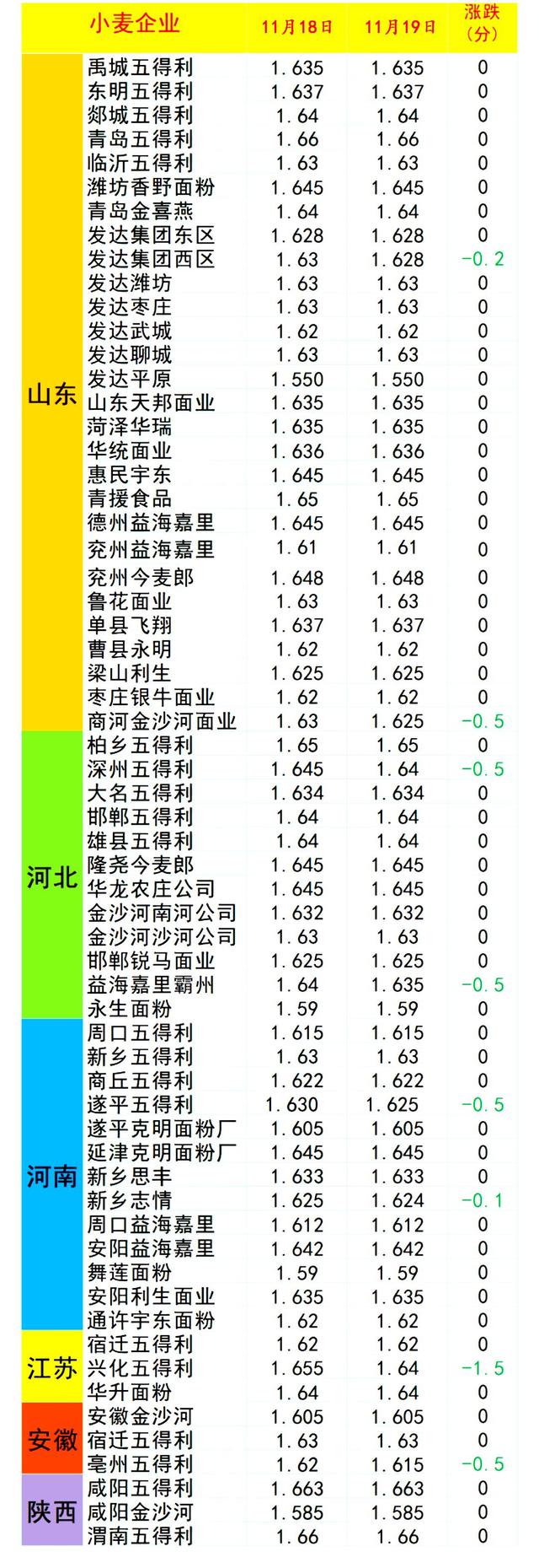 其中,在国内市场,山东发达集团西区、商河金沙河、深州五得利、霸州益海嘉里、遂平五得利、新乡志情面粉、江苏兴化五得利以及亳州五得利,企业窄幅落价2~30元/吨,国内主流小麦价格仍维持在1.6~1.65元/斤左右!