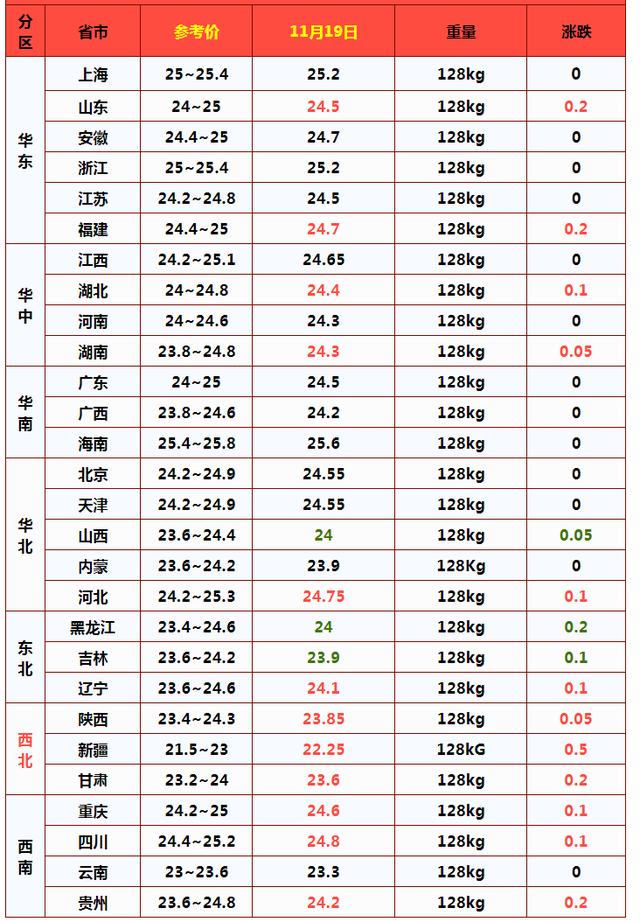 据数据了解,11月19日,猪价反弹幅度仅有0.06元/公斤,猪价维持在24.25元/公斤左右,生猪均价与贵州、河南以及广西等地相差不大,而在国内市场,北方地区,猪价看跌情绪有所升温,部分散户猪场认价出栏情绪再次转浓,市场看涨情绪回落,黑吉辽部分地区,猪价止步上涨,吉林地区,猪价再次跌破24元/公斤!而在南方市场,猪价上涨表现偏弱,大部地区企稳,局部市场反弹幅度仅有0.1~0.2元/公斤!