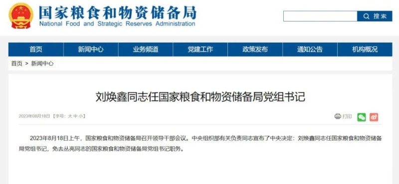 2023年8月18日上午,国家粮食和物资储备局召开领导干部会议。中央组织部有关负责同志宣布了中央决定:刘焕鑫同志任国家粮食和物资储备局党组书记,免去丛亮同志的国家粮食和物资储备局党组书记职务。