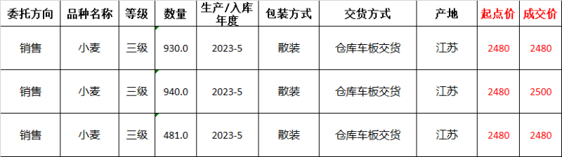 惠州新供销天润粮油储备有限公司委托销售2023年江苏小麦2351吨,全部成交,底价2480元/吨,成交价2480-2500元/吨。