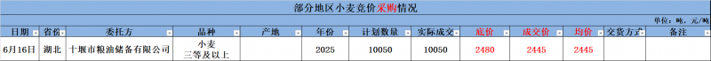 6月16日湖北省地方储备小麦采购交易结果