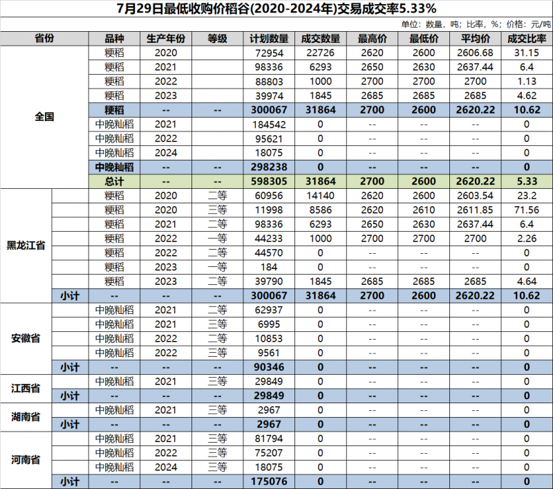 湖南:黄华占稻谷到厂价2840-2980元/吨,大米4320-4440元/吨;中晚籼稻谷2580-2660元/吨,大米3840-3920元/吨。