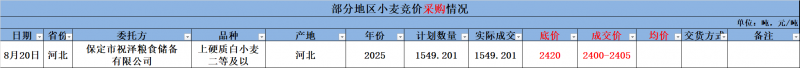 滨州市沾化区泰和仓储物流有限公司计划采购2025年山东三等及以上白小麦4500吨,实际成交1000吨,成交价格为2420元/吨。