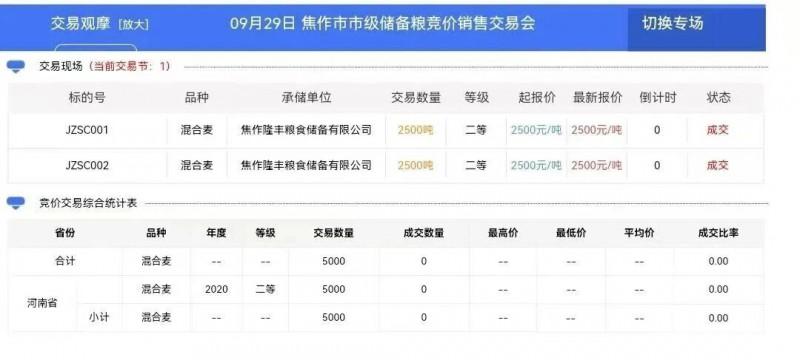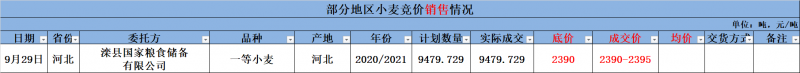 海阳市粮食收储有限公司竞价销售2022、2023年山东一等混合麦1478.96吨,全部成交,成交价格2425元/吨。