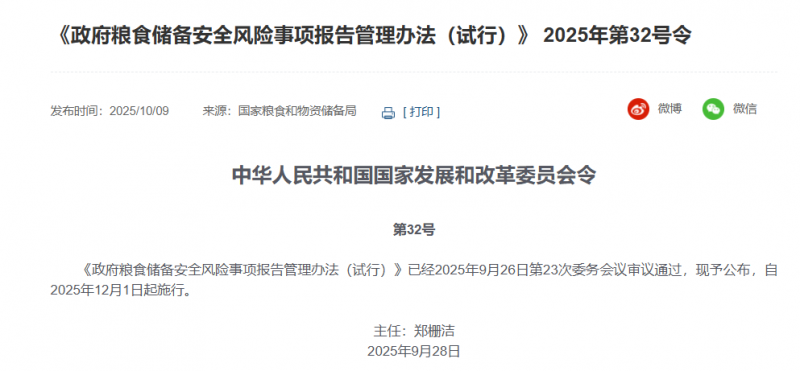 国家发改委公告,《政府粮食储备安全风险事项报告管理办法(试行)》已经2025年9月26日第23次委务会议审议通过,现予公布,自2025年12月1日起施行。