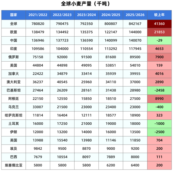 本月美国农业部将2025/26年度全球小麦产量预期进一步调高436万吨,达到8.4217亿吨,同比增长4136万吨或5.16%(上月预测增长3704万吨或4.6%)。