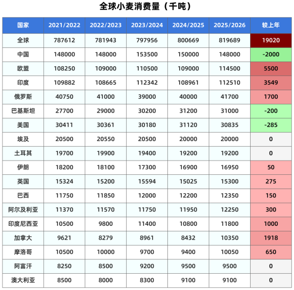 本月维持澳大利亚小麦产量预期3700万吨不变,加拿大产量也维持在3996万吨,欧盟小麦产量维持在1.44亿吨不变。乌克兰产量维持2300万吨不变。印度小麦产量预期维持不变,仍为1.1795亿吨。