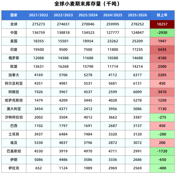 继上月将全球库存调高344万吨后,本月又将全球小麦期末库存调高338万吨至2.7825亿吨,同比增长1825万吨或7.02%(上月预测增长1484万吨或5.7%),也高于市场预期的2.762亿吨。