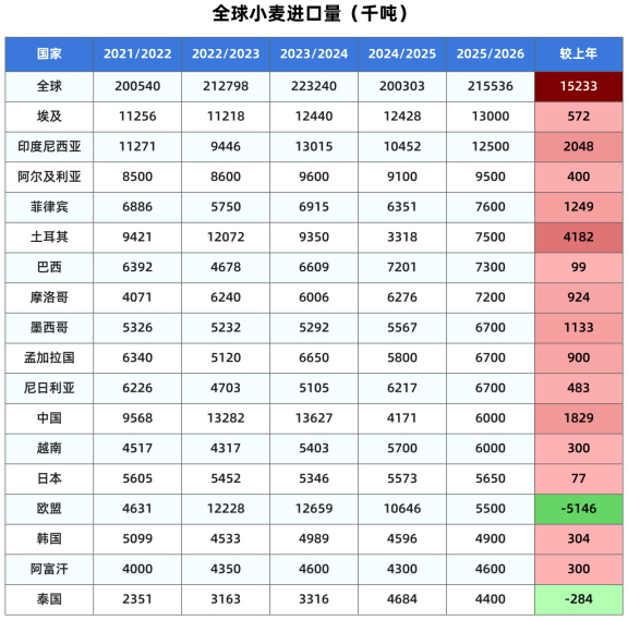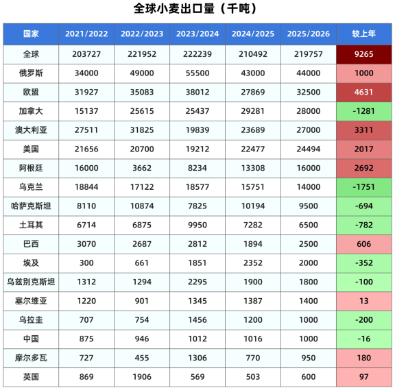 本月预测全球小麦的饲料用量为1.6544亿吨,上月预测1.6519亿吨;出口2.1976亿吨,上月预测2.1871亿吨。