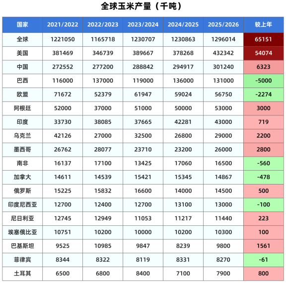 本月预计2025/26年度全球玉米产量为12.9601亿吨,较12月份预测值12.8296亿吨调高1305万吨,比上年高出6515万吨或5.29%(上月预测增长5235万吨或4.3%)。