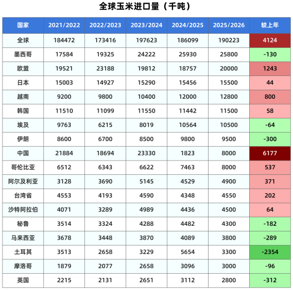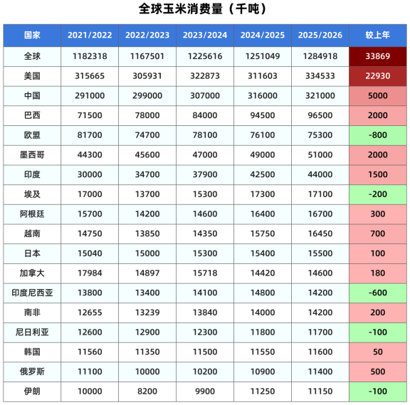 其他生产国的玉米产量预期维持不变,其中巴西产量1.31亿吨,阿根廷5300万吨;欧盟产量5675万吨,俄罗斯产量1450万吨,乌克兰2900万吨,墨西哥2600万吨,加拿大1487万吨。