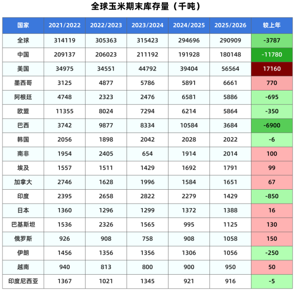 本月将全球玉米期末库存调高1176万吨,从上月预测的2.7915亿吨调高至2.9091亿吨,远高于市场预期的2.80亿吨,但是仍比2024/25年度减少379万吨或1.29%(上月预测同比降低1422万吨或4.8%)。