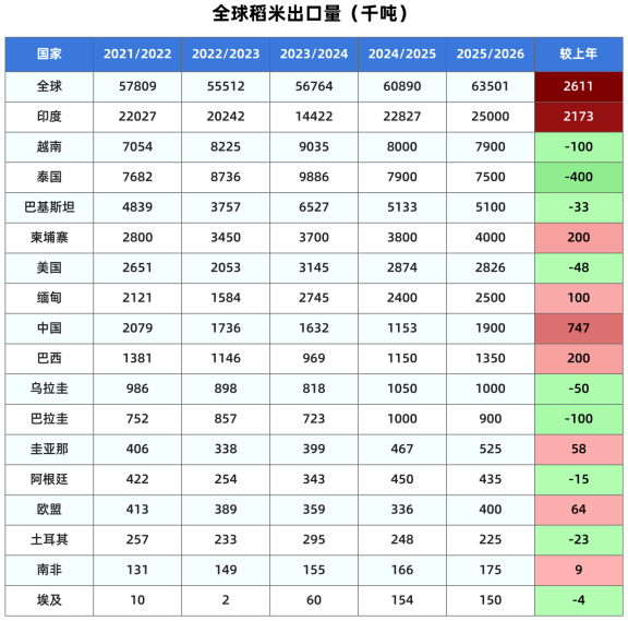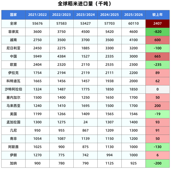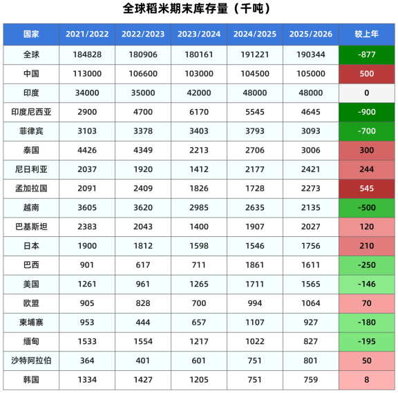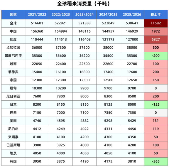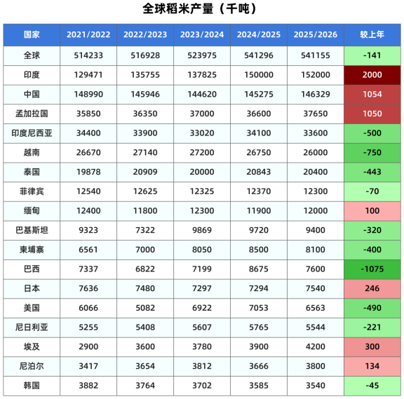 美国农业部发布的最新供需报告显示,2025/26年度中国大米产量预计为1.4633亿吨,较上月预测值调高约33万吨,比上年增加0.7%。大米期初库存上调100万吨至1.045亿吨。大米进口预测不变,仍为300万吨,较上年增加28.2%。大米期末库存预计为1.05亿吨,较上月调高50万吨,比上年增加0.5%。