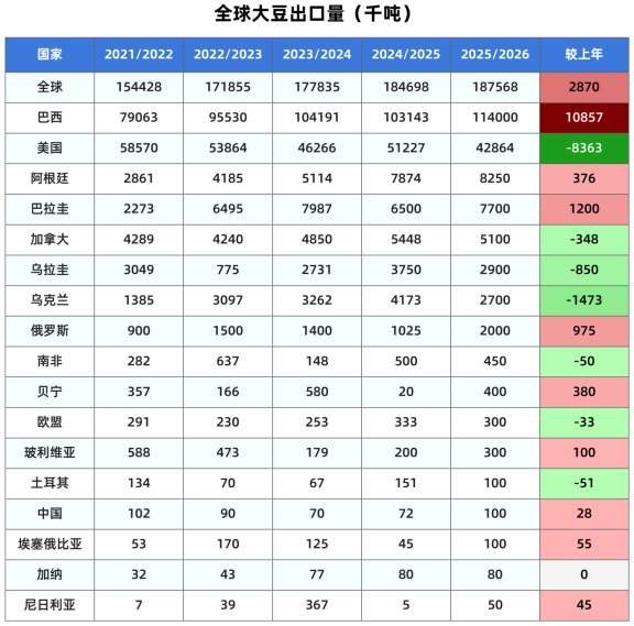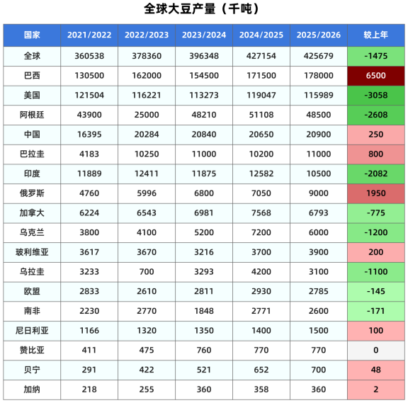 本月预计2025/26年度全球大豆产量为4.2568亿吨,较上月预测的4.2254亿吨调高314万吨,但是比上年产量减少147万吨或0.34%(上月预测减少461万吨或1.1%)。