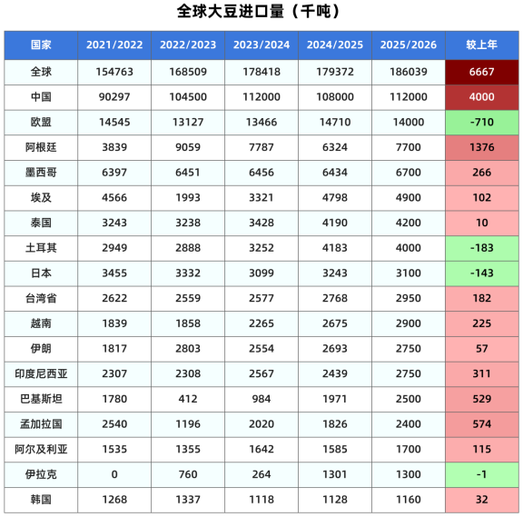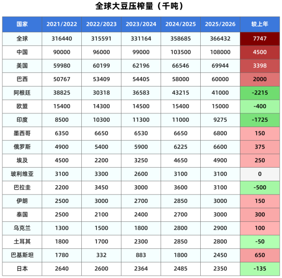 全球大豆压榨量从上月预测的3.6524亿吨调高到3.6643亿吨。但是出口量从1.8770亿吨小幅调低到1.8757亿吨。