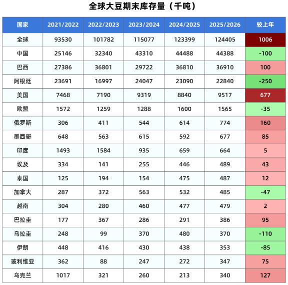 本月将全球大豆期末库存调高至1.2441亿吨,较上月预测的1.2237亿吨高出204万吨,也高于市场预期的1.231亿吨。如果预测成为现实,将比2024/25年度高出101万吨或0.82%(上月预测库存同比减少87万吨或0.7%)。