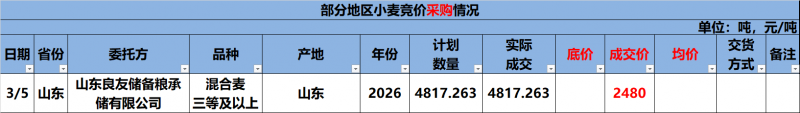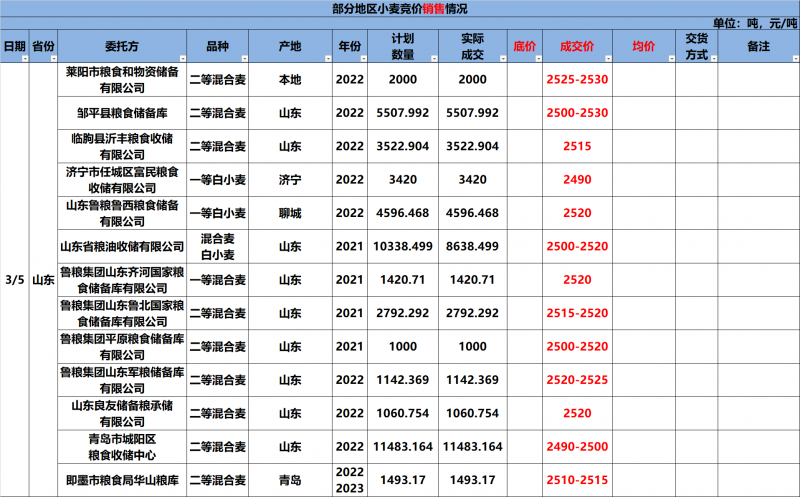 3月5日山东储备小麦竞价交易会成交结果