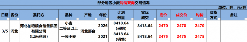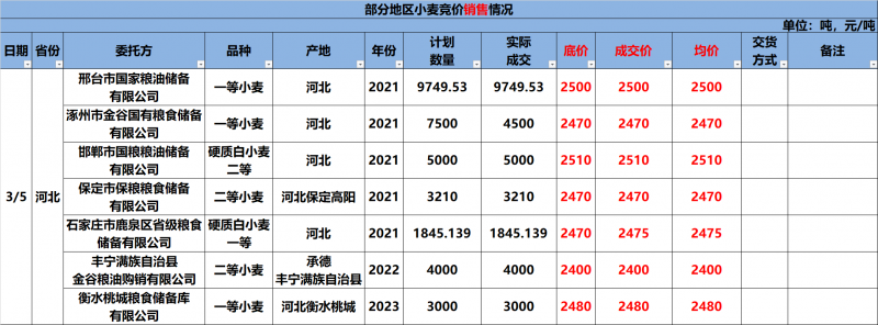 3月5日邯郸市国粮粮油储备有限公司销售2021年产二等硬质白小麦5000吨,全部成交,起拍价格调整为2510元/吨,成交价2510元/吨。3月5日衡水桃城粮食储备库有限公司销售2023年产一等小麦3000吨,全部成交,起拍价格为2480元/吨,成交价2480元/吨。3月5日邢台市国家粮油储备有限公司竞价销售2021年产一等小麦9749.53吨,全部成交,底价2500,成交价2500