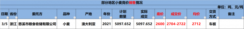 3月5日浙江省储备澳麦销售结果
