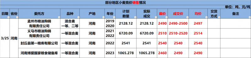 3月25日,国家粮食交易中心最低收购价小麦竞价销售800149吨,成交740992吨,成交率92.61%。成交均价2397.54元/吨,最高价2510元/吨,最低价2320元/吨。对比上周50万吨托市小麦拍卖,本周随着数量增加至30万吨,成交数量、成交价格均有所下降,政策性拍卖持续进行,参与主体谨慎操作!